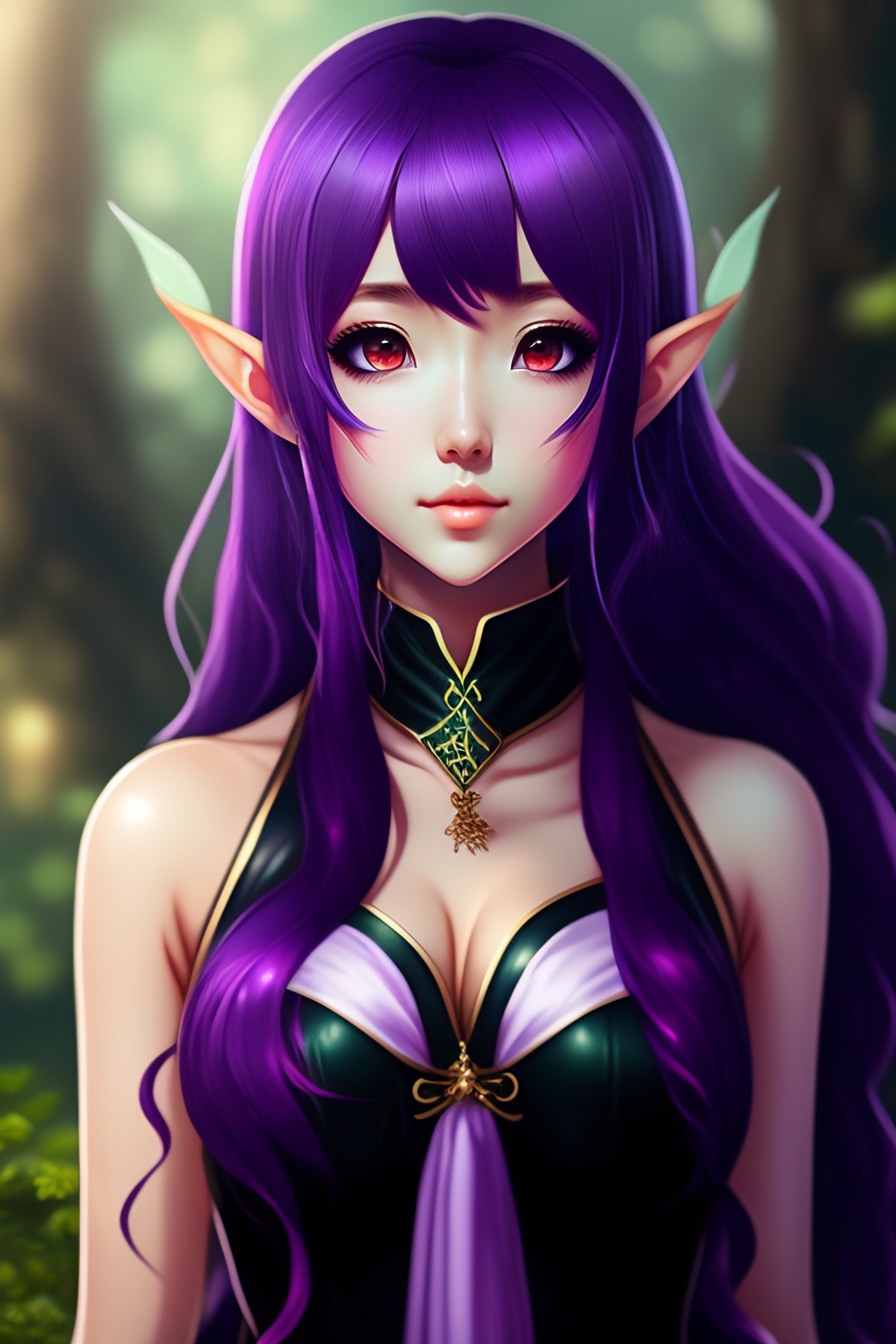 Full Body 20 Year Old Girl Anime Forest Elf Purple Hair Black Color Dress Lexica